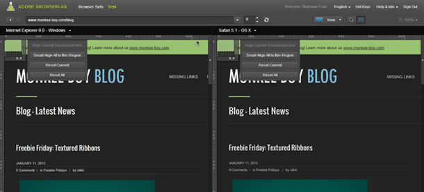 Man, where was this tool 10 years ago? Adobe Browser Labs is free (with Adobe User ID) and allows you to easily preview and test sites across multiple browsers at the same time. View one browser at a time, side-by-side with synchronized scrolling, or as "onion skins" where you can easily fade in and out of different browsers to quickly tell of any variations. Love it.